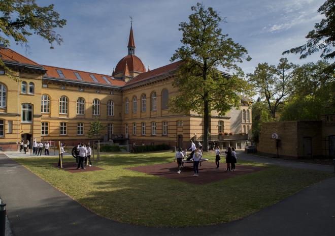 The school is located in a beautiful historical mansion on the territory of the park ensemble of the late XIX century in the Marzan Bisdorf district. Well-kept courtyards and lawns for relaxation, a garden, a playground for relaxing outside - and modern classrooms, fast Wi-Fi and a computer class inside.